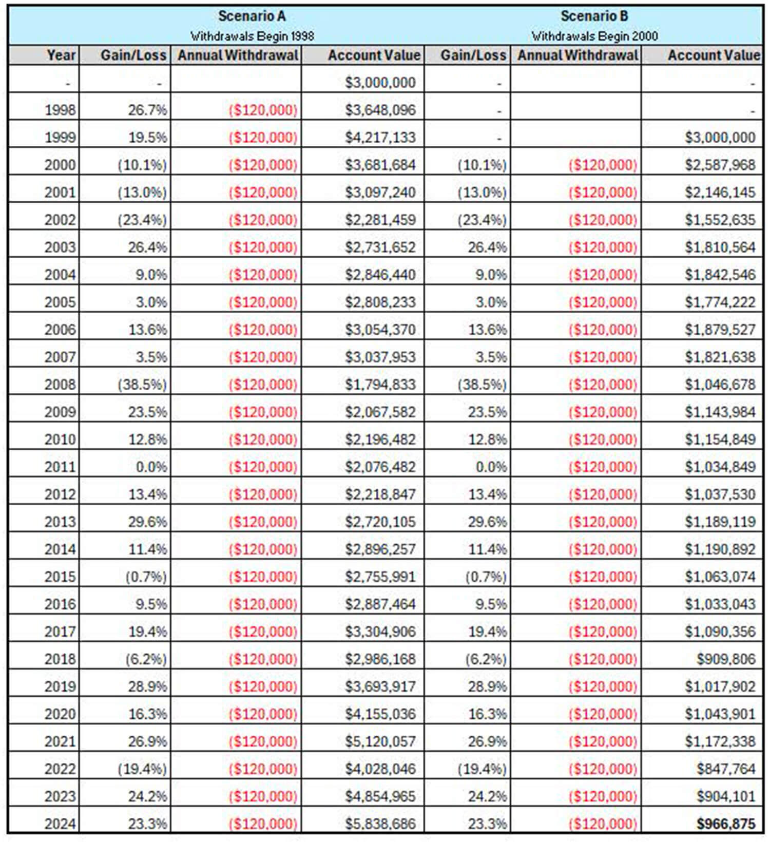 Let’s compare two early retirees with identical portfolios: each starts with $3 million, withdraws $120,000 annually, and earns the same returns over time.
