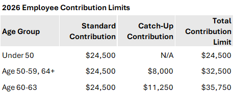 As part of your year-end planning, we recommend reviewing your current retirement contribution elections to ensure they align with the new 2026 limits.